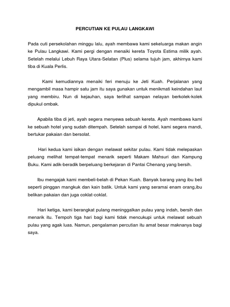 Tentukan Lokasi Percutian Dari segi lokasi banyak elemen yang perlu dimasukkan antaranya ialah. Karangan Bercuti Ke Pulau Langkawi Pada cuti sekolah yang lalu kami sekeluarga berpeluang bercuti ke sebuah tempat peranginan iaitu Pulau Langkawi. Tiket bot laju ke pulausehala2hala 5.